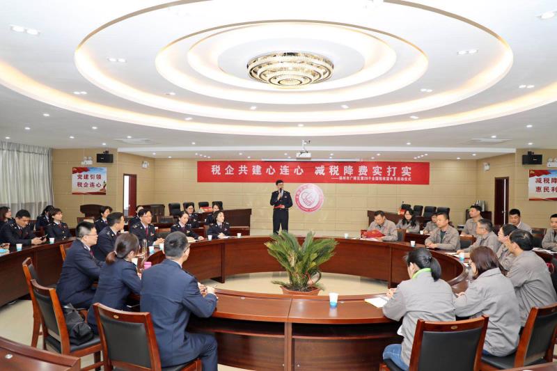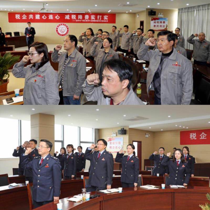 2019年全國兩會剛剛落下帷幕,3月28日上午,廣陵區(qū)第28個全國稅收宣傳月啟動儀式和稅企共建活動在我公司隆重舉行;顒右浴岸惼蠊步ㄐ倪B心減稅降費實打實”為主題,廣陵區(qū)稅務局局長樊正軍、副局長王正軍、廣陵區(qū)第一分管局局長邱嵩、總公司財務總監(jiān)楊紅霞、我公司財務總監(jiān)章勇、廣陵第一稅務局黨支部、本司第四黨支部全體黨員共同參加本次活動。